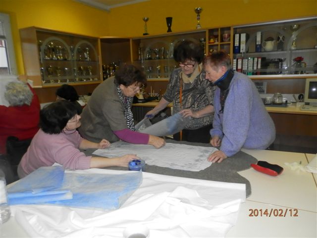 Naše članice so tehnike priprave na šivanje prtov osvajale od g. Margit Horvat in g. Irene Nyakaš iz Lendave, ki že vrsto let poučujeta te veščine. Pri tej tehniki se uporablja posebna pasta, s katero se po preluknjanem vzorcu namaže na pergament papir, ki na prt zariše vzorec.